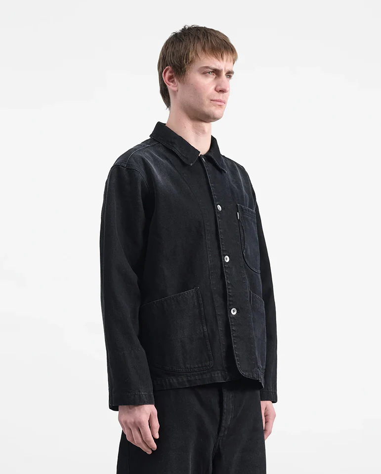 Constructed chore jacket cut fromĀ 13.5oz organic cotton denim. Designed with a classic collar, dual entry chest patch pockets, lower patch pockets and metal button fastening.