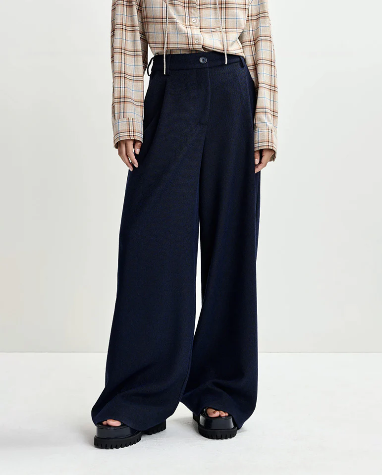 The Jester Pants are designed with pleats at the waist and an exaggerated wide-leg silhouette. Finished with slanted front pockets, two welt pockets at the back, a zip and button fastening, and pressed creases at the front and back for a polished finish.