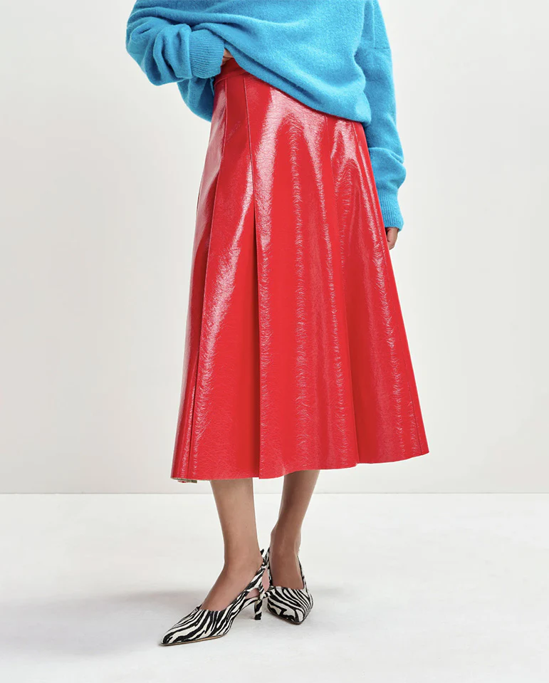 Designed with a fitted waistband, this midi-length skirt falls to an A-line shape, accentuated by the inverted pleat details. It is made from a butter-soft faux leather, designed for a relaxed fit.