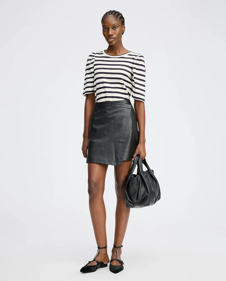 Striped t-shirt with light, elegant puff sleeves. Designed in organic cotton with a round neck and low shoulder seam.