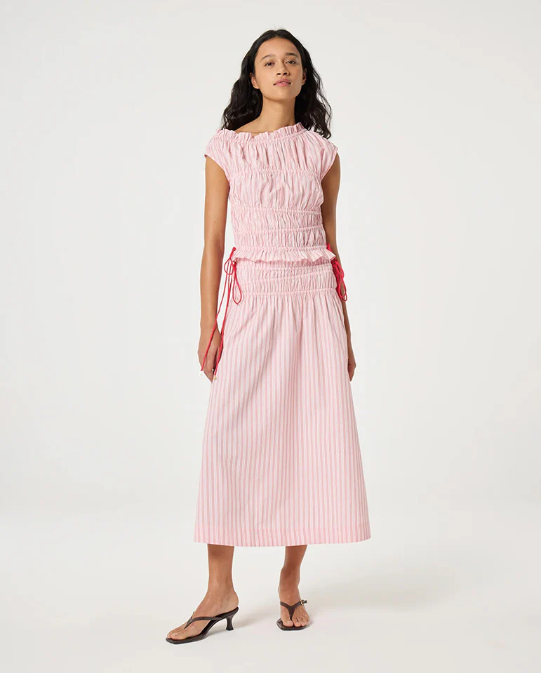 The John Top is a sleeveless statement piece in fine pink and white stripes, designed with an asymmetrical neckline and ruched tie detailing (non adjustable).