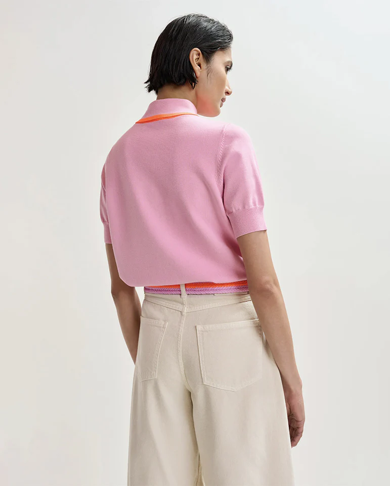 Refined fine-knit polo designed for a relaxed fit. The Jonda features ribbed trims that frame the silhouette with subtle structure and the standout detail - a contrasting collar tied like a small scarf.