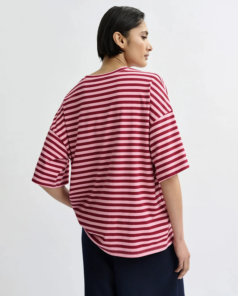 Soft cotton T-shirt cut for a boxy, oversized silhouette, featuring short sleeves and a clean round neckline. Crafted in a striped two-color design with rhinestones scattered all over, wear it tucked into tailored trousers or let it elevate your go-to denim.