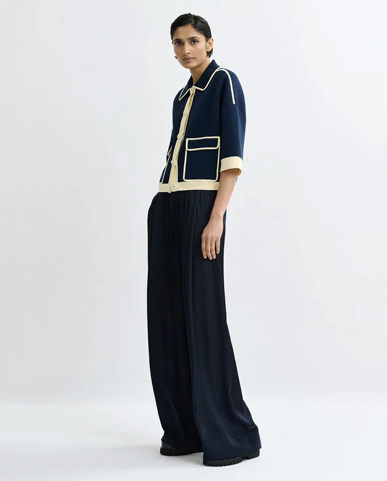 Essentiel Antwerp cardigan crafted from a fine knit for lightweight comfort. Designed for a relaxed fit, it features charming flower snap buttons and bold contrast trim for a playful touch. Finished with flap pockets and cropped 3/4 sleeves.