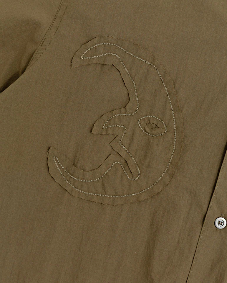 Heresy shirt with a camp collar, applique graphics with raw edge and gun metal buttons. Designed for a relaxed fit, the Tatter Shirt pairs perfectly with jeans or shorts.