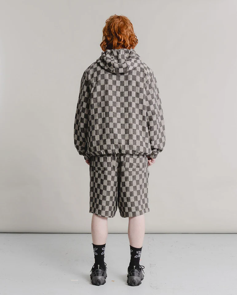 Knee-length shorts in a woven checkerboard fabric, features a YKK zip fly and gun metal button and a printed patch label.